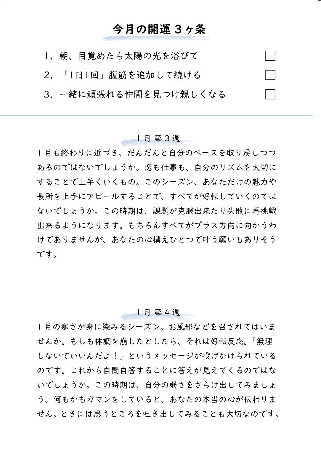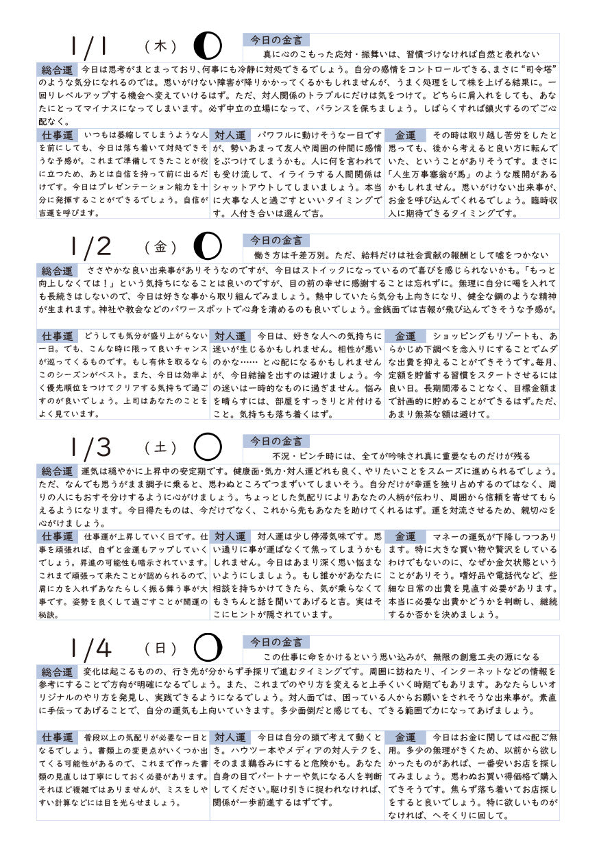 「総合運」「仕事運」「対人運」「金運」「今日の金言」の5項目を365日毎日掲載。